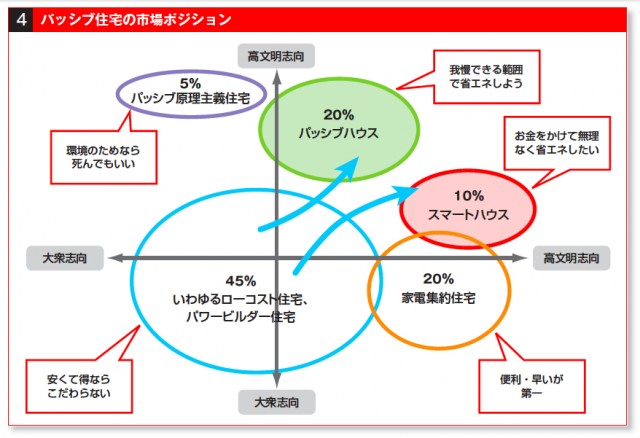 これまで、ほとんど省エネや自然エネルギーに関心を持たなかった多くの一般消費者(最も大きいボリューム層)が、環境やリスク対応という大きな風に乗って、スマートハウス的左脳市場に流れ込めば大手企業連合に対して有利となり、パッシブハウスの方に向かえば中小住宅会社にも勝機が生まれる。