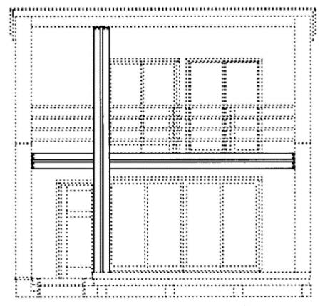 意匠登録第1571668号の正面図。実線で表した部分が「部分意匠」として意匠登録されている。正面の柱と梁で十字を構成する印象的なデザインが特徴