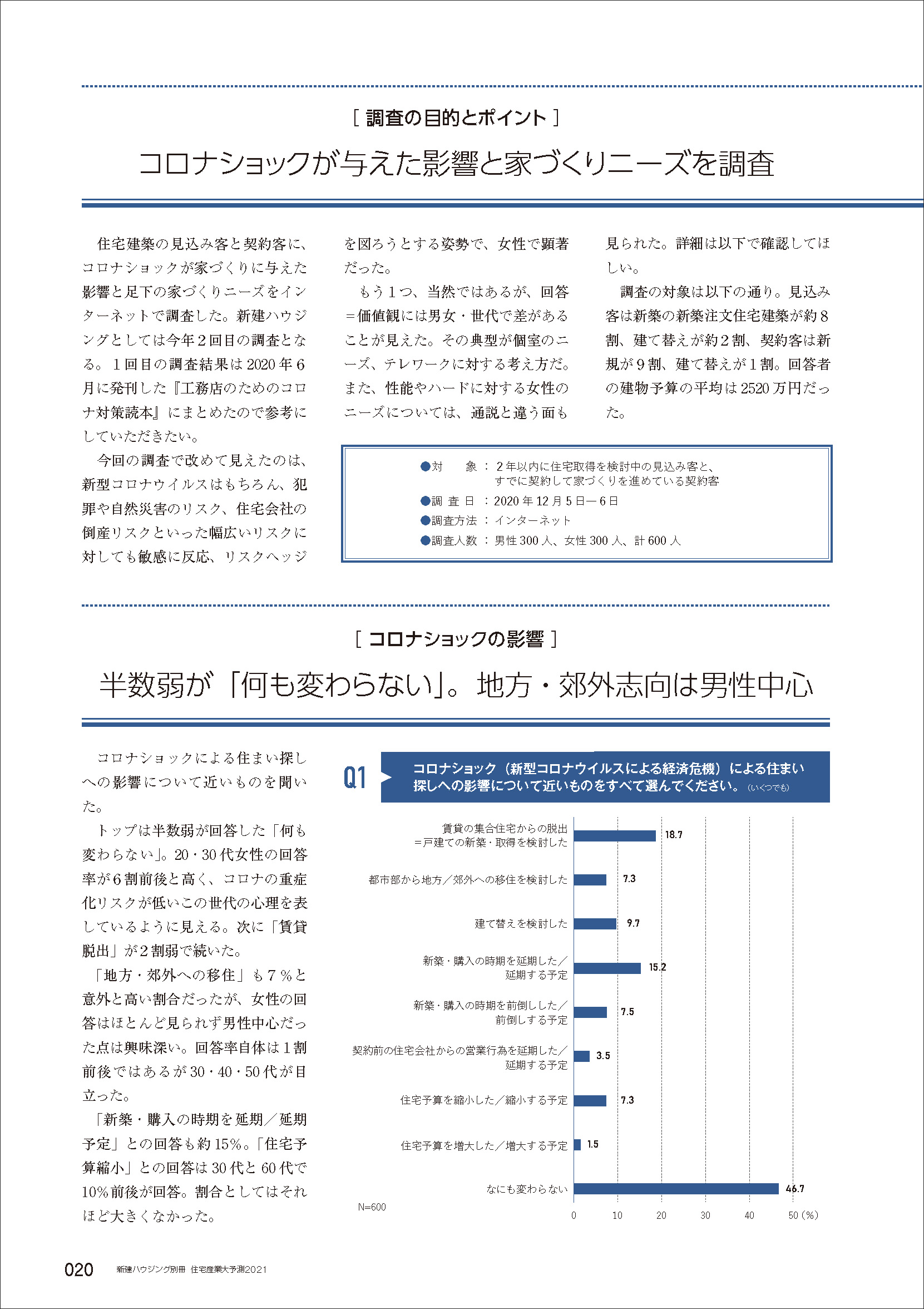2021年が真にアフターコロナと呼べる状況となるかは不透明ですが、本書はアフターコロナを見据え、住宅市場・住宅業界の何が変わり・変わらないのか、地方の時代・工務店の時代とするには何を変え・何を残すべきなのか、市場や生活者に何を訴えどうアプローチしていくべきかを、4つのキーワードをベースに分析&予測&解説・提言します。