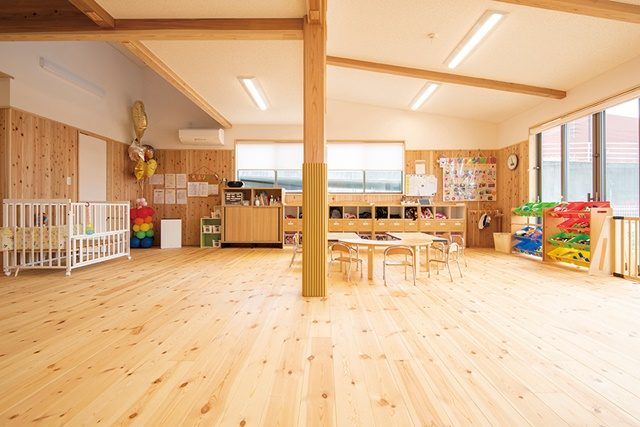 エコワークスが設計・施工を手掛け、熊本県内で初めて『ZEB』認証を取得した木造保育園「NPO法人こどもサポート・みんなのおうち」内観。内装には同社の住宅と同様、無垢材など自然素材を多用