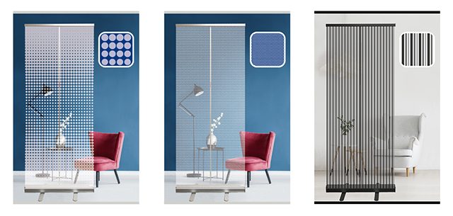 白、もしくは黒を基調とするPETフィルムに、ストライプやドット柄などを施した全6種類をラインアップ。清潔で爽やかな印象のデザインで、オフィスの会議スペースや店舗内のテーブルなどの仕切りとして使用できる。場所を選ばないシンプルなデザインのため、さまざまな用途や場所で設置可能。