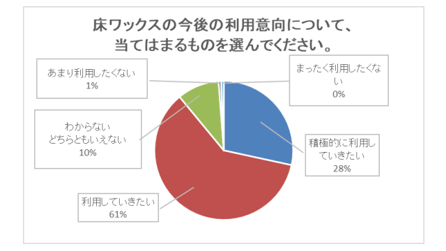 自粛期間中に初めてワックス掛けをした人は2割。残りの8割は、それ以前にもワックス掛けをしたことがあると回答した。今後の床ワックスの利用意向としては、「積極的に利用していきたい」が28.4%、「利用していきたい」が 60.6%と、9割近くの人が今後も床ワックスを利用したいと考えていることがわかった。
