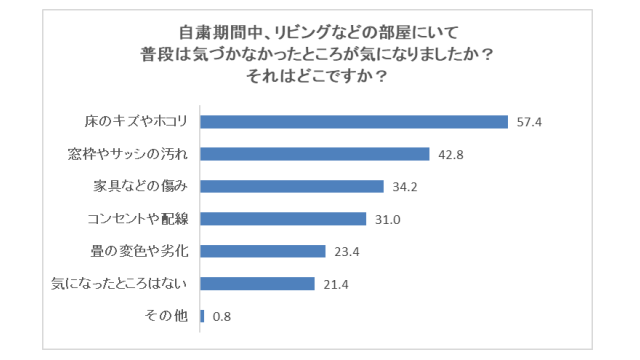 自粛期間中、リビングなどの部屋にいることが多くなったことで普段は気づかなかったような場所が気になったか、またそれはどこかを聞いたところ、「床のキズやホコリ」(57.4%)との回答が最も多かった。次いで「窓枠やサッシの汚れ」(42.8%)、「家具などの傷み」(34.2%)、「コンセントや配線」(31.0%)、「畳の変色や劣化」(23.4%)となった。