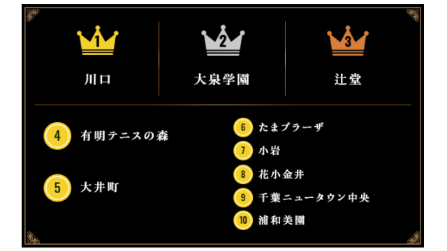 1位は昨年に引き続き埼玉県の「川口」が獲得した。新たに東口エリアでの再開発も予定されており、今後さらなる利便性の高まりが期待できることから 2年連続1位に選出された。続く2位には東京都の「大泉学園」、3位には神奈川県の「辻堂」がランクインした。