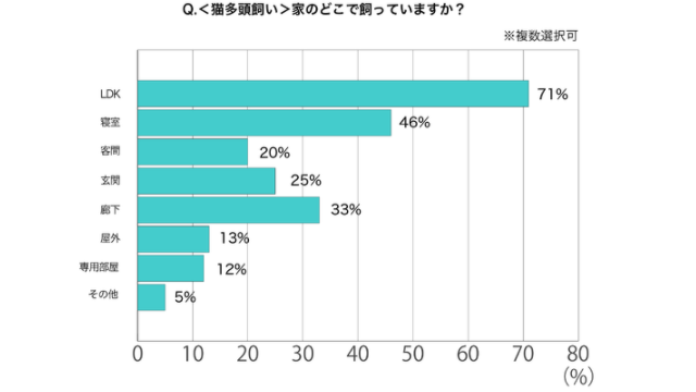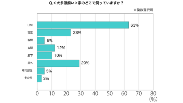 犬を多頭飼いしている人に対し、どこで飼育しているか聞いたところ、「LDK」が63%と最も多かった。理由としては「いつも一緒にいられるから」、「家族の目が届くから」などの声が聞かれた。次いで「屋外」(29%)、「寝室」(23%)となった。猫を多頭飼いしている人に対しても同様の質問をしたところ、「LDK」(71%)との回答が最も多く、「寝室」(46%)、「廊下」(33%)と続いた。なお、猫については屋内全般を飼育場所とし、一部の部屋を除き自由に行き来できるようにしている家庭も多いことがわかった。