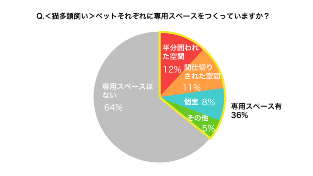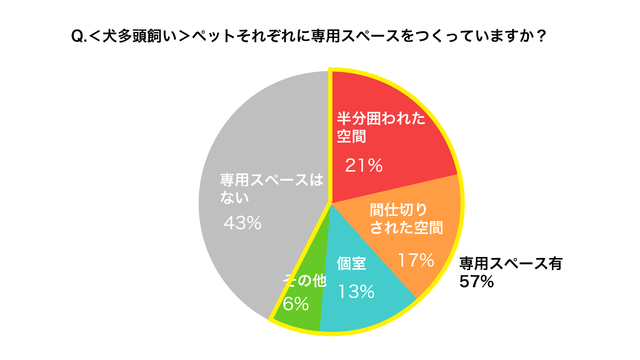 ペットに「専用スペース」を作っている割合は、犬多頭飼いが57%、猫多頭飼いが36%となった。専用スペースの内訳としては、犬多頭飼いでは「半分囲われた空間」が21%、「間仕切りされた空間」が17%、「個室」が13%、「その他」が6%となった。猫多頭飼いでは「半分囲われた空間」が12%、「間仕切りされた空間」が11%、「個室」が8%、「その他」が5%だった。