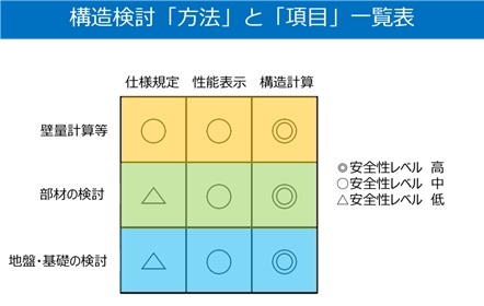 仕様規定では簡易計算として①壁量の確保(壁量計算)、②壁の配置バランス(四分割法)、③柱の柱頭柱脚の接合方法(N値計算法)を規定しているだけで、その他、木造住宅の骨組みとなる「柱や梁等の部材検討」、木造住宅を支える「地盤・基礎の検討」は仕様のルールが決められているだけで、建物ごとに安全性の計算をする規定ではありません。