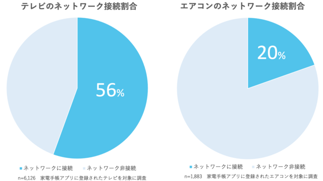 家庭での保有割合が最も高かった「テレビ」と、ホームオートメーションの実現例で取り上げられることがある「エアコン」について調査をしたところ、「家電手帳」に登録されたテレビのうち56%がWi-Fiに接続され、「スマートテレビ」として利用されていることがわかった。一方で、Wi-Fiが接続され「スマートエアコン」として利用されているエアコンの割合は20%にとどまった。