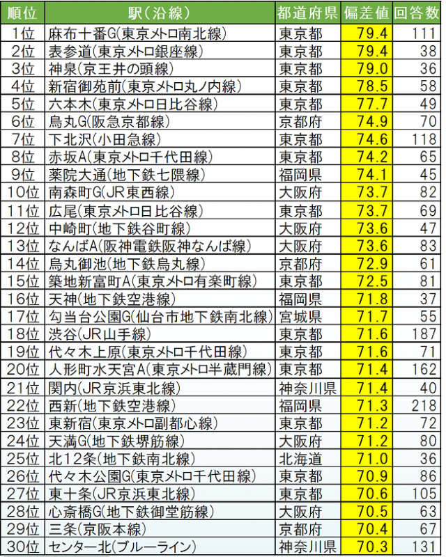コンシャスな街・駅ランキングでは、「麻布十番(東京都)」が1位となった。2位「表参道(東京都)」、3位「神泉(東京都)」と続き、トップ10のうち7駅が東京都という結果になった。東京都以外からは6位に「烏丸(京都市)」、9位に「薬院大通(福岡市)」、10位に「南森町(大阪市)」がランクインした。