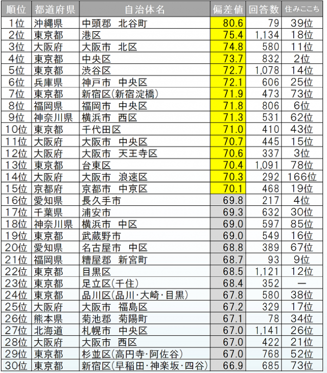 ランキングは、文化施設や娯楽施設、飲食店の充実度、地元出身でない人のなじみやすさ、外国人の多さなど街の多様性、新しいことへの住民の柔軟性など14問について、そこに住んでいる人からの回答を「そう思う=2点」~「そうは思わない=-2点」として平均値を集計して作成。偏差値形式で順位付けをしたもの。
