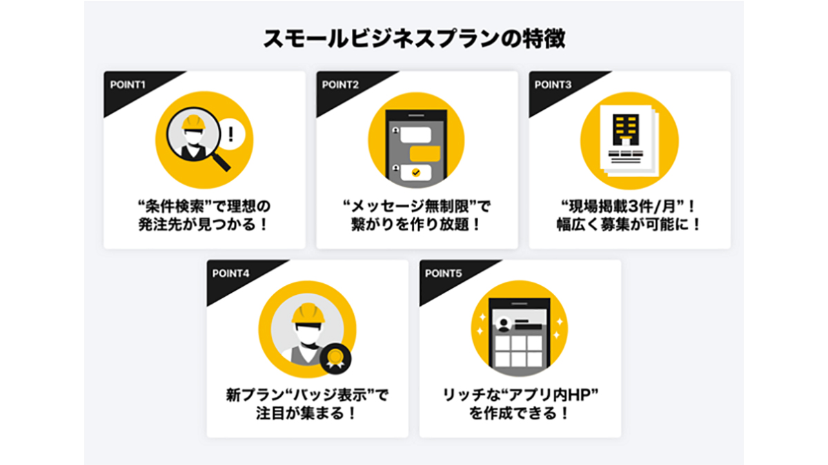 「助太刀ビジネス」と「助太刀エンタープライズ」は、「助太刀」の法人向けサービス。全76職種の職人・工事会社に、募集やメッセージで直接アプローチできるほか、複数社員での情報共有やアクセス解析の機能も搭載している。