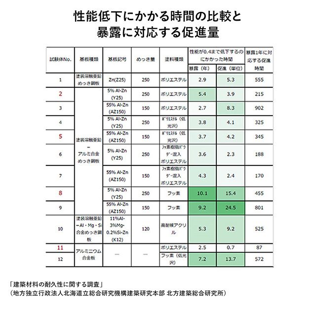 塗装の耐久性については、地方独立行政法人北海道立総合研究機構建築研究本部 北方建築総合研究所による「建築材料の耐久性に関する調査」が参考になる。同調査ではさまざまな種類の塗装鋼板に対して複数の耐久性試験を行っている。それぞれの試験で性能が初期の4割まで低下するのにかかった時間を比較すると、ポリエステル塗料には耐久性の低いものが多く、フッ素パウダー入りやフッ素塗料では耐久性の向上が認められている。
