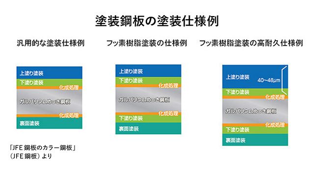 上塗り塗装は意匠性の付与と水と酸素、腐食性イオンなどを遮断する役割を担う。長期間の遮断には塗膜の耐久性が求められる。
