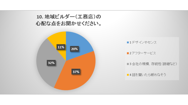 検討予定の住宅会社については、75%が「大手ハウスメーカーと地域ビルダー(工務店)両方を比較する」と回答。「大手ハウスメーカーのみで比較する」が19%、「地域ビルダーのみで比較する」が2%となった。地域ビルダーの心配な点としては「アフターサービス」(37%)との回答が最も多く、「会社の規模・存続性」(32%)、「デザインやセンス」(20%)と続いた。