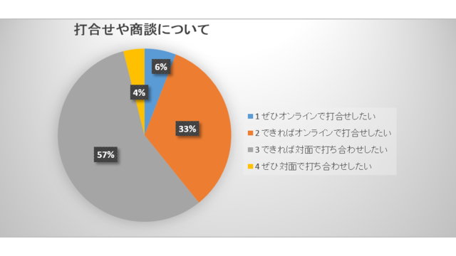 打ち合わせや商談の方法としては、「対面」を希望する人が約6割、「オンライン」を希望する人が約4割だった。