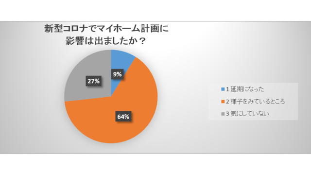 新型コロナでマイホーム計画に影響が出たか聞いたところ、「様子を見ているところ」が64%と最も多く、次いで「延期になった」が9%と、新型コロナの影響でマイホーム計画を延期・様子見している人が7割強となった。
