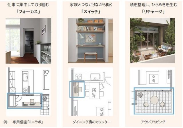 同住宅では、3つの「NEW NORMAL DESIGN(ニューノーマルデザイン)」を提案。「STAY DESIGN(ステイデザイン)」では、約3メートルの高天井と高窓による開放感のあるLDKや、医療施設の設計手法を応用した感染症予防のためのゾーン分けを提案し、家での時間が多くなるこれからの時代に対応している。また、需要拡大が予想される在宅ワークスペースには、仕事に集中できる「フォーカス」、家族とつながりながら働く「スイッチ」、頭を整理しひらめきを生む「リチャージ」の3つのワークスタイルメソッドを用意。制震装置や太陽光発電システムを標準仕様とし、蓄電池や燃料電池などを提案するなど、災害へのレジリエンスも強化している。