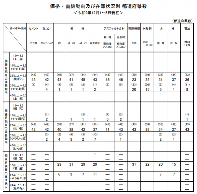 国土交通省は12月25日、同月1日〜5日現在の「主要建設資材需給・価格動向調査」の結果を発表した。セメント、生コンクリート、骨材、アスファルト合材、鋼材、木材、石油の7資材13品目について、価格動向はすべての資材が「横ばい」、需給動向はすべての資材が「均衡」、在庫状況はすべての資材が「普通」だった。