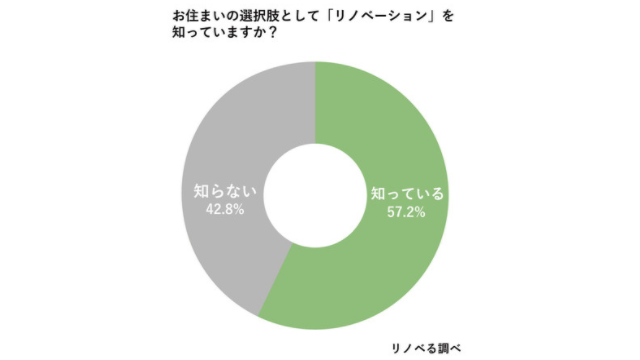 住まいの選択肢として「リノベーション」を知っているかとの問いに「知っている」と回答した人は57.2%。リノベーションの認知度は一般と比較して低いことがわかった。