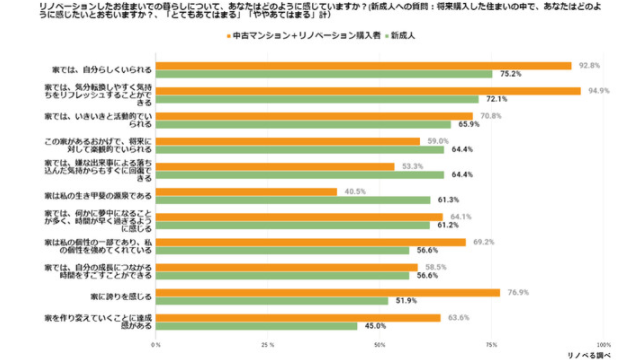 「いつかは住宅を購入したい」と回答した人に対し、将来購入した住まいでどのように感じたいかを聞いたところ、「自分らしくいられる」(75.2%)と「気分転換しやすく、気持ちをリフレッシュすることができる」(72.1%)がともに7割を超え、次いで「いきいきと活動的でいられる」(65.9%)となった。同社によると、新成人が重要視する項目は、リノベーション経験者が住まいで感じているとした項目と近い傾向にあるという。