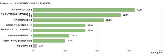 「知っている」と回答した人に、リノベーションでどのようなことができると思うか聞いたところ、「好みのデザインに変える」(79.3%)との回答が最も多かった。「キッチンや風呂など住宅設備を新しくする」(68.4%)、「好みの間取りに変える」(55.2%)も5割を超えており、リノベーションの特徴については多くの新成人が理解していることが判明した。なお「建て替えに比べ97%のCO2排出量削減が見込める」など、環境負荷低減につながることへの理解は24.7%に留まったが、2020年6月に同社が実施した調査で20~60歳以上の人に対して同様の設問を行った結果(9.3%)と比較すると高い数値だった。