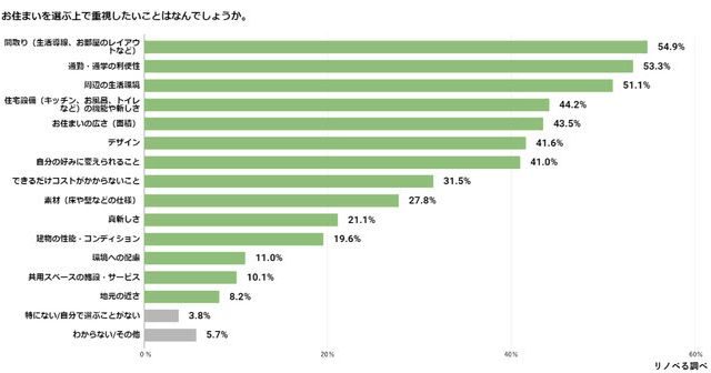 住まい選びで重視したいこととしては、「間取り(生活導線、部屋のレイアウトなど)」(54.9%)が最多。次いで「通勤・通学の利便性」(53.3%)、「周辺の生活環境」(51.1%)、「住宅設備(キッチン、風呂、トイレなど)の機能や新しさ」(44.2%)「広さ(面積)」(43.5%)となった。同社によると、この結果はリノベーション経験者の満足度が高い項目と重なっているといい、リノベーションにより実現性の高い項目が重視されている結果となった。また、「自分好みに変えられること」(41.0%)、「できるだけコストがかからないこと」(31.5%) といったZ世代の個性重視や合理性を求める特徴が現れる項目も上位にランクインした。