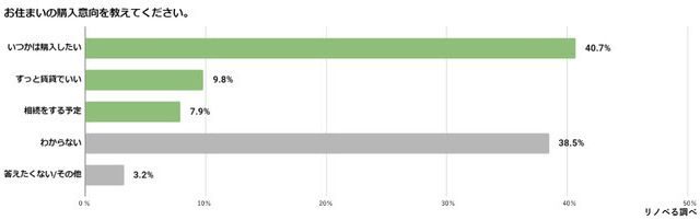 将来的な住まいの意識(住宅の購入意向)を調べたところ、賃貸希望者(9.8%)の約4倍にあたる40.7%が「いつかは住宅を購入したい」と回答した。「わからない」(38.5%)と回答した人を除いた場合では、66.2%が「いつかは購入したい」を選んだこととなり、総務省が発表している全国の持ち家比率である61.2%と比較しても同等の結果となった。