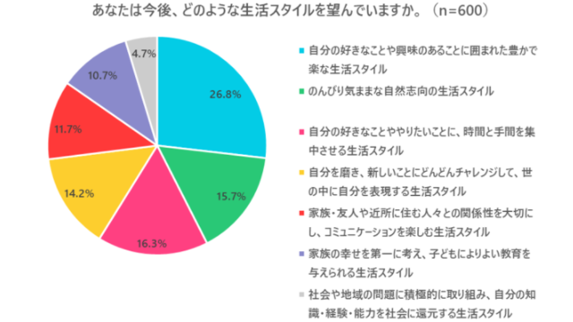 今後、どのような生活スタイルを望んでいるか聞いたところ、最も多かった回答は「自分の好きなことや興味のあることに囲まれた豊かで楽な生活スタイル」(26.8%)だった。次いで「自分の好きなことややりたいことに、時間と手間を集中させる生活スタイル」(16.3%)、「のんびり気ままな自然志向の生活スタイル」(15.7%)と、気負いせずに好きなことを中心にした生活スタイルがトップ3を占める結果となった。野心を求めるような「自分を磨き、新しいことにどんどんチャレンジして、世の中に自分を表現する生活スタイル」は14.2%と上位には入らなかった。「家族・友人や近所に住む人々との関係性を大切にし、コミュニケーションを楽しむ生活スタイル」と「家族の幸せを第一に考え、子どもによりよい環境を与えられる生活スタイル」は、それぞれ11.7%と10.7%。SDGsやエシカルを志向するような「社会や地域の問題に積極的に取り組み、自分の知識・経験・能力を社会に還元する生活スタイル」は4.7%に留まった。