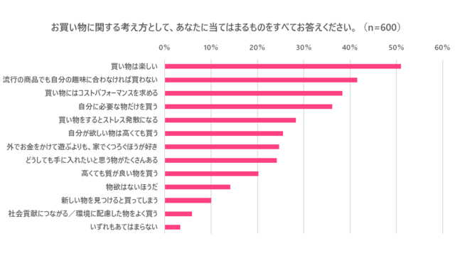 買い物に関する意識・考え方としては、「買物は楽しい」(51.0%)が最も多く、「流行の商品でも自分の趣味に合わなければ買わない」(41.5%)、「買い物にはコストパフォーマンスを求める」(38.3%)、「自分に必要な物だけを買う」(36.2%)「買い物をするとストレス発散になる」(28.3%)と続いた。買い物自体を楽しんでいることが伺えるものの、その買い物スタイルとしては無駄遣いをせず賢く消費する傾向が高いことがわかった。