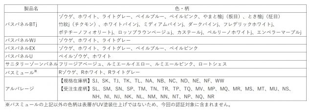 抗菌SIAA認証を取得したのは、「バスパネル(BTj、WJ、EX、U)」「サニタリーゾーンパネル」「アルパレージ」「バスミュール」の一部。