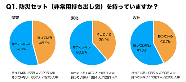 アントロット(東京都中央区)は、関東在住者1215人と東北在住者1091人を対象に、防災セット(非常用持ち出し袋)に関するアンケート調査を実施し、その結果を発表した。