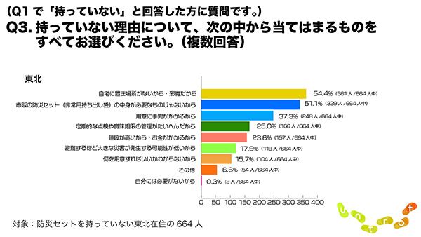東北在住者では「自宅に置き場所がないから・邪魔だから」(54.4%)との回答が最多。「市販の防災セットの中身が必要な物じゃないから」(51.1%)、「用意に手間がかかるから」(37.3%)と続いた。