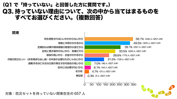 「防災セットを持っていない」と回答した人に対しその理由を聞いたところ、関東在住者では「何を用意すれば良いかわからないから」(52.7%)との回答が最も多かった。次いで「用意に手間がかかるから」(49.5%)、「定期的な点検や賞味期限の管理が大変だから」(39.1%)となった。