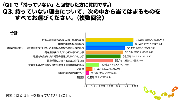 全体では「自宅に置き場所がないから・邪魔だから」(44.0%)との回答が最も多く、次いで「用意に手間がかかるから」(43.4%)、「市販の防災セットの中身が必要な物じゃないから」(36.2%)となった。