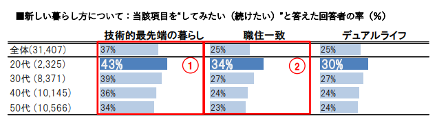 「技術的最先端の暮らし」「職住一致」「デュアルライフ(二拠点生活)」といった新しい暮らし方への関心を調べたところ、全ての項目において20代が最も高い関心を示した。中でも20代の関心が最も高かったのは「技術的最先端の暮らし」で、他世代が34%~39%であるのに対し、20代は43%となった。また「職住一致」では20代が34%で、他世代より7~11ポイント高くなった。