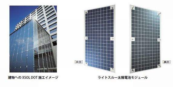 同製品は、強化ガラスに穴をあけ、ボトルで支持して構造体に固定する「ドットポイント工法」をライトスルー太陽電池モジュールに応用。接続端子をドットポイントに内蔵し、配線コードを支柱に収めることで、意匠性を向上させた。
