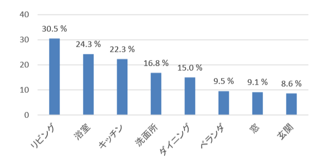 リフォームができるならばしたい場所としては「リビング」(30.5%)が最も多く、「浴室」(24.3%)、「キッチン」(22.3%)と続いた。