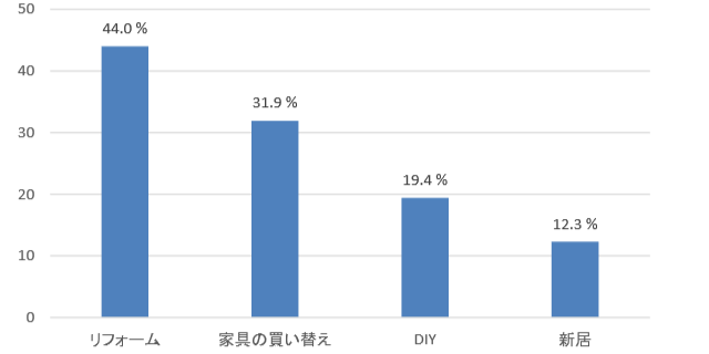 住まいをより良くするために検討したい方法を聞いたところ、「リフォーム」(44%)との回答が最も多かった。次いで「家具の買い替え」(31.9%)、「DIY」(19.4%)となった。