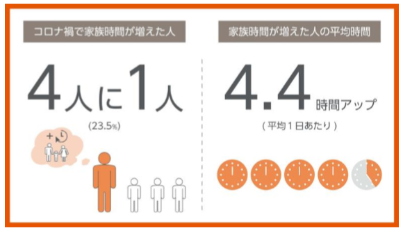 コロナ禍で以前と比べて家族の時間が変化したか聞いたところ、23.5%が「家族時間が増えた」と回答。増えた時間の平均は1日あたり4.4時間となった。また、在宅勤務の有無で見ると、在宅勤務を実施している人では、32.6%が「家族時間が増えた」と回答した。