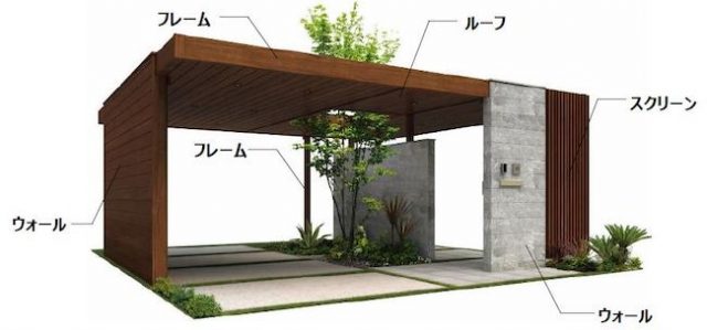 「フレーム」「ルーフ」「スクリーン」「ウォール」の4つのパーツを自由に組み合わせることで、建物と一体感のある屋根付きのファサード空間やアウトドアリビング空間をつくることができるアルミ形材のエクステリア商品。
