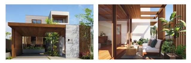 施工イメージ 左:アプローチ屋根・カールーフ、右:アウトドアリビング
