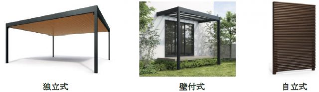 「フレーム」は、カールーフやエントランスゲートをつくる「独立式」、建物とつながりのあるテラス空間をつくる「壁付式」、フェンスでは表現しにくい印象的な外観をつくる「自立式」の3つの設置方法をそろえた。サイズバリエーションが豊富で、独立式4本柱は幅6015×奥行6166×有効高さ3000mmの超大空間まで対応可能。