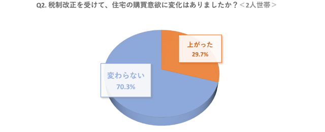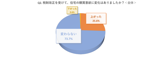 住宅ローン減税の要件緩和を受けて、住宅の購買意欲に変化があったか聞いたところ、25.6%が「購買意欲が上がった」と回答した。「変わらない」が73.7%、「購買意欲が下がった」が0.6%だった。