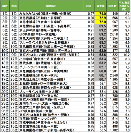 トップの「みなとみらい線」は、イメージや生活利便性の評価が特に高かった。2位は評点0.96で「東急目黒線」(不動前~多摩川、同9.3万円)、3位は0.95で「東急東横線」(代官山~多摩川、同9.1万円)、4位は0.91で「東急世田谷線」(三軒茶屋~下高井戸、同9.0万円)、5位は0.91で「京王井の頭線」(神泉~吉祥寺、同9.4万円)となった。トップ3に関しては昨年と変動がなかった。