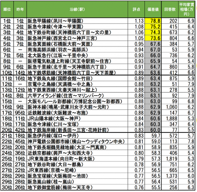 トップの「阪急甲陽線」は、イメージや行政サービスの評価が特に高かった。2位は評点1.08で「阪急今津線」(今津~甲東園、同6.4万円)、3位は1.06で「地下鉄谷町線」(天神橋筋六丁目~文の里、6.2万円)、4位は1.05で「阪急神戸線」(西宮北口~神戸三宮、同6.6万円)、5位は0.95で「阪急箕面線」(石橋阪大前~箕面、同5.7万円)となった。トップ4までは、順位の変動はあるものの昨年と同じ顔ぶれとなった。昨年調査ではランキング対象外だった沿線が、50沿線中5つ(6位「南海高師浜線」、8位「阪堺電気軌道」、12位「京電中之島線」、15位「大阪モノレール彩都線」、43位「叡山電鉄鞍馬線」)ランクインした。