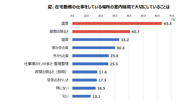 2020年の夏、在宅勤務をしている場所の室内環境で大切にしていることを聞いたところ「温度」(63.3%)が最も多く、「昼間の明るさ」(40.7%)、「湿度」(33.2%)と続いた。在宅勤務をしている場所で大切にしていることとしては「したいことに集中できる」(41.3%)、「リラックスできる」(33.8%)、「落ち着きがある」(32.4%)、「したいことが効率的・スムーズにできること」(29.6%)が上位に挙げられた。
