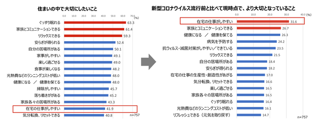 住まいの中で大切にしていることを聞いたところ、「ぐっすり眠れる」と「家族とコミュニケーションできる」がともに60%以上となった。続いて「リラックスできる」(59.3%)、「安らぎが得られる」(52.4%)となった。新型コロナウイルス流行前と比べてより大切になっていることとしては、「在宅の仕事がしやすい」が31.6%と最多。次いで「家族とコミュニケーションできる」(26.7%)となった。