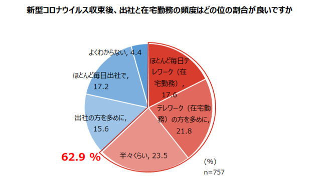 新型コロナウイルス収束後、出社と在宅勤務(テレワーク)の割合はどのくらいが良いか聞いたところ、「ほとんど毎日テレワーク」が17.6%、「テレワークのほうを多めに」が21.8%、「半々くらい」が23.5%と、6割以上の人が在宅勤務の割合を半数以上にしたいと考えていることがわかった。特に、週3日以上在宅勤務をしている人では、その割合が8割を超えた。