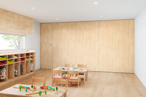 高齢者施設、幼稚園、保育園などに幅広く対応する。可動間仕切り一式(ストレートレールプラン、枠外幅4470-5371mm、パネルFFデザイン、6枚)が税別128万4000円〜。