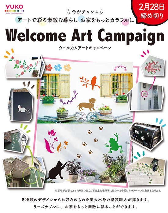 神奈川県・東京都を中心に外壁塗装工事を展開するユーコーコミュニティー(神奈川県厚木市)は1月26日、おうち時間でさらに我が家のことが好きになる「ウェルカムアートキャンペーン」を開始した。期間は2月28日まで。